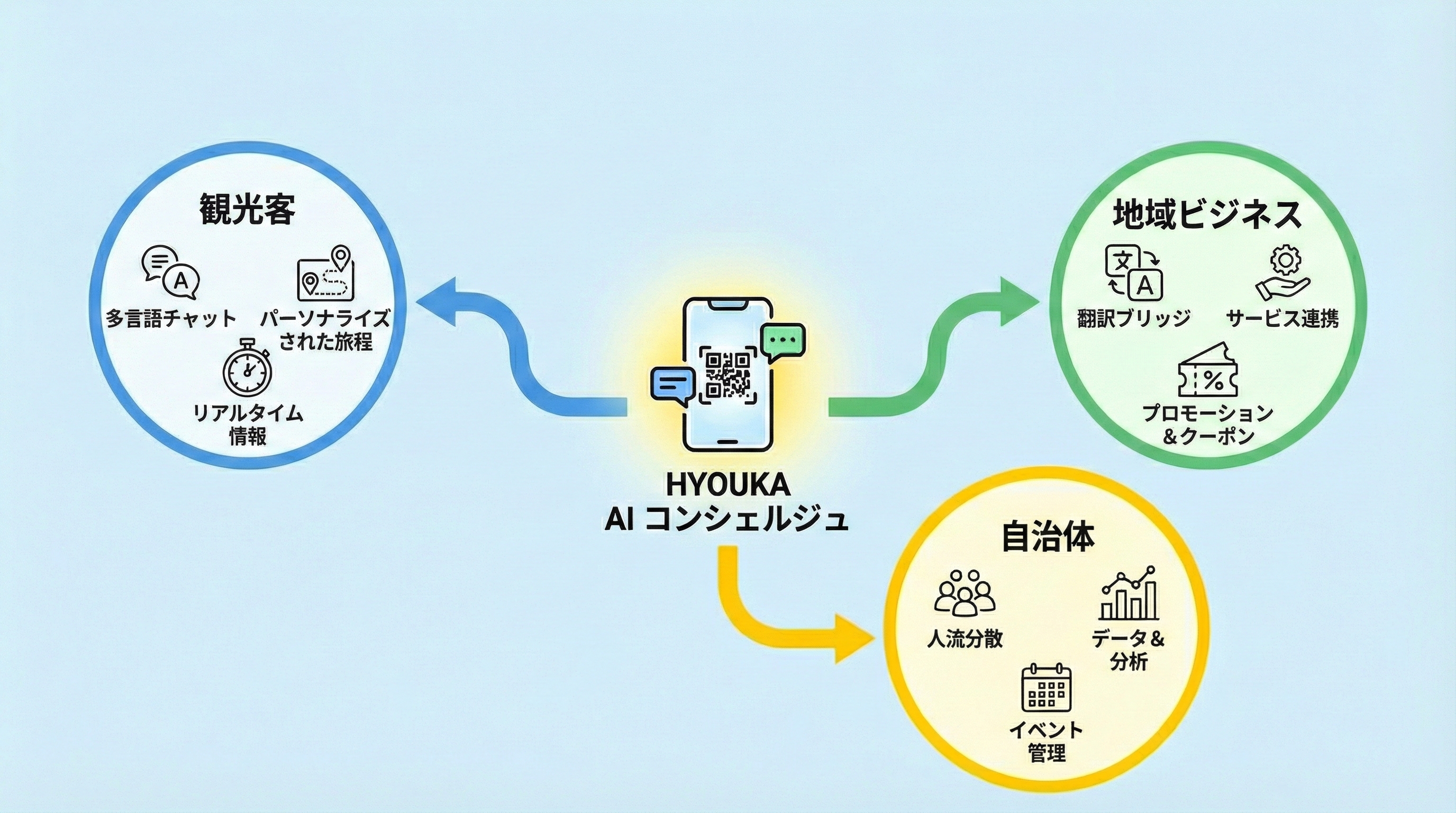 HYOUKA Conciergeは、観光とイベントのために開発されたAIコンシェルジュです。主な機能をご紹介します。