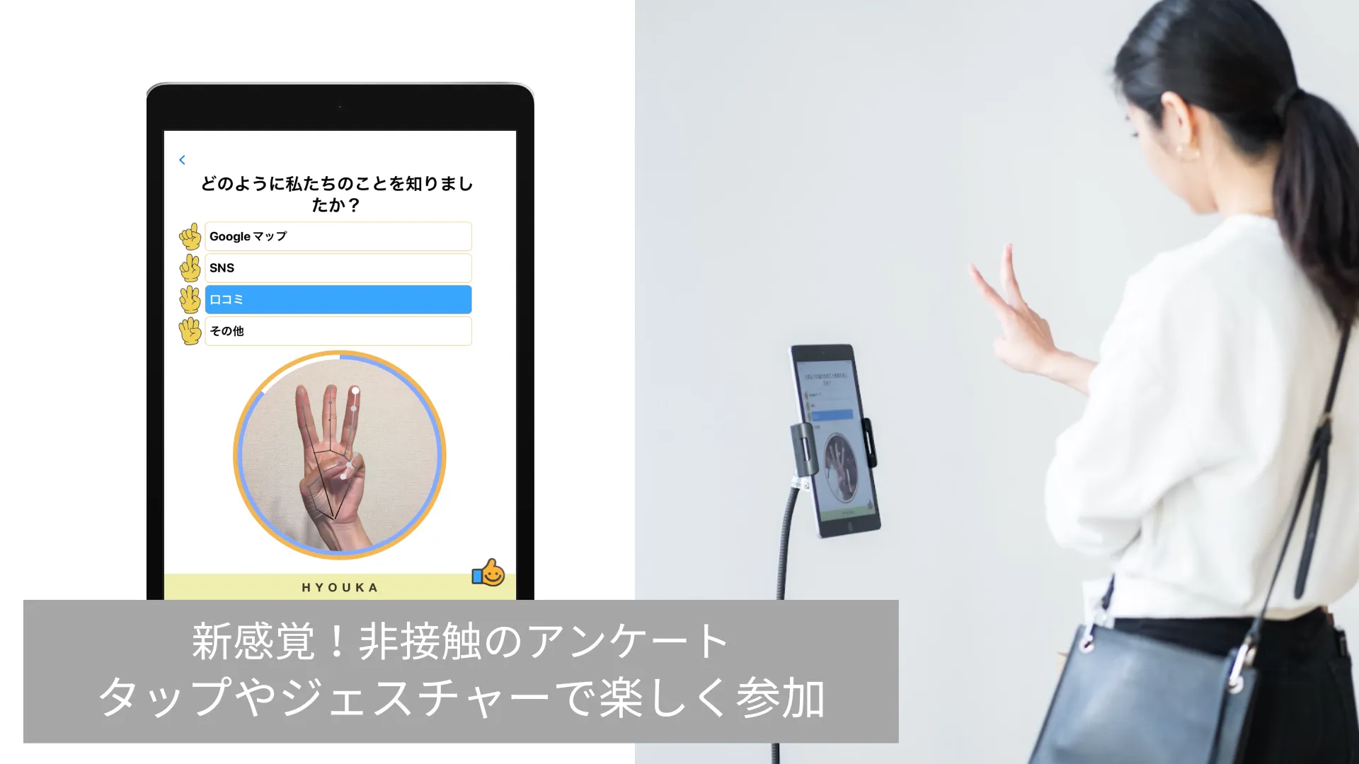 HYOUKAは、AIカメラによるデモグラフィック推定と非接触ジェスチャー操作を組み合わせた初のアンケートアプリです。従来のアンケート方法よりも高い回答率と豊富なデータを提供します。