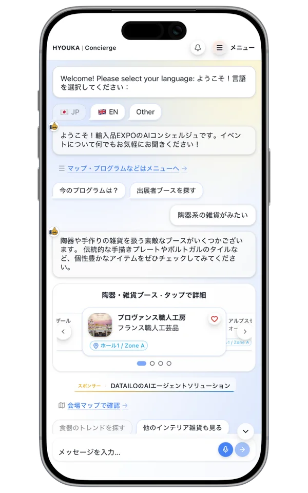 来場者のスマートフォン1台で、会場のQRコードを読み取るだけ。アプリのダウンロードは不要で、30ヶ国語以上に対応するAIコンシェルジュが即座にサポートします。