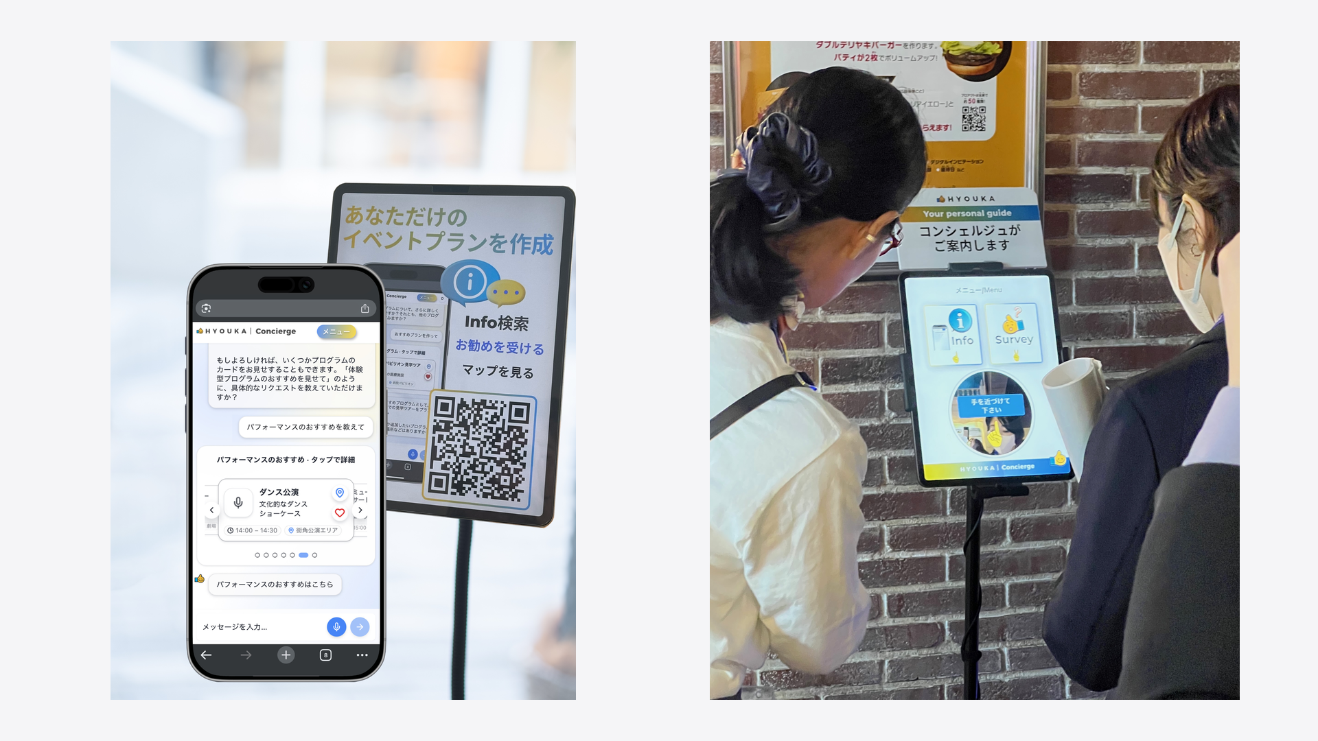 今回は、モバイルHYOUKA AIコンシェルジュをAIカメラアンケートシステムと組み合わせて活用しました。これにより、カメラ搭載キオスクを通じたその場でのフィードバック収集と、アンケートキオスクからコンシェルジュへのアクセス導線の両方を実現しました。